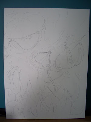 Pencil on canvas. Painting number 2 isn't a mirror copy of the first one. I changed the expression on the second painting. I wanted this one to look sad instead of angry. I wanted them to look interesting side by side or back to back, so a little bit of semi symmetry was o.k.